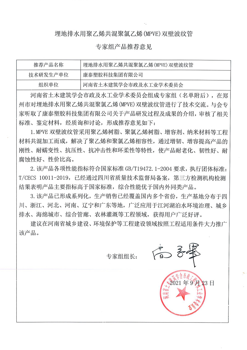 與此同時,河南省土木建筑學(xué)會市政工程及水工業(yè)學(xué)術(shù)委員會的專家組在鄭州市,對康泰集團埋地排水用聚乙烯共混聚氯乙烯(MPVE)雙壁波紋管進行技術(shù)交流后,與會專家通過審核相關(guān)標準、鑒定材料,經(jīng)質(zhì)詢和討論后形成推薦意見如下:建議在河南省城鄉(xiāng)建設(shè)、環(huán)境保護等工程建設(shè)領(lǐng)域按照工程適用條件大力推廣該產(chǎn)品。