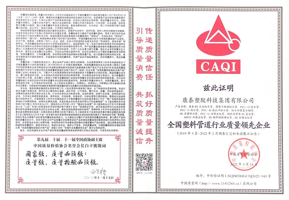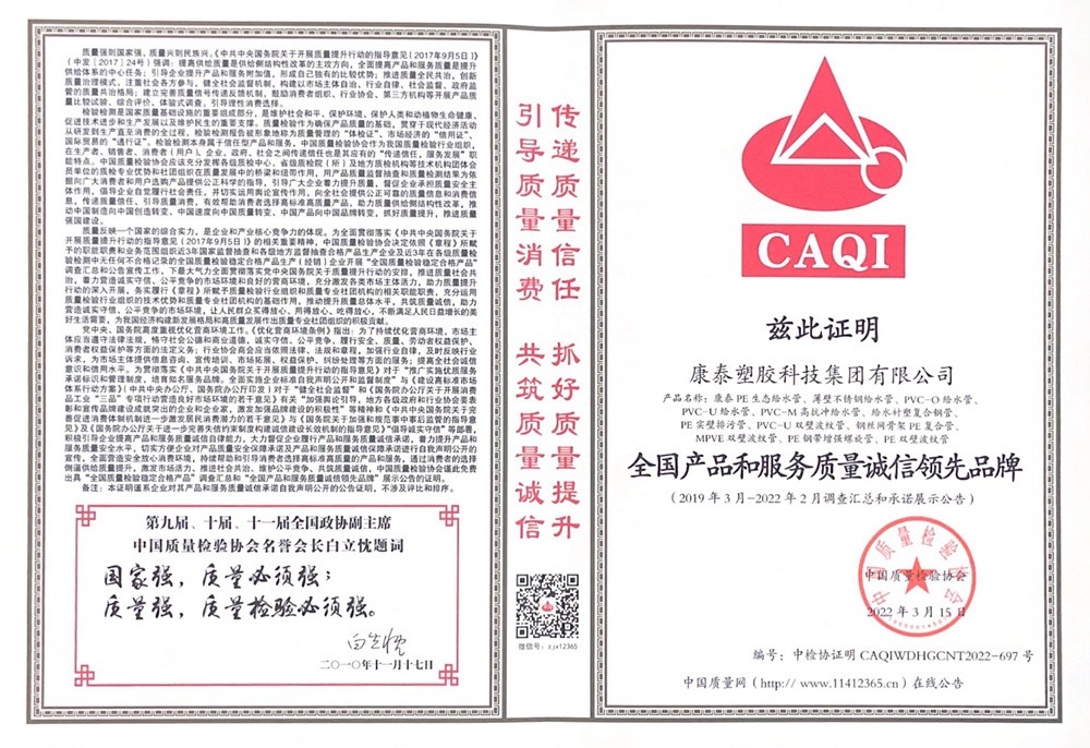 近日,憑借優(yōu)質(zhì)的產(chǎn)品、完善的服務、良好的口碑,康泰集團一舉榮獲中國質(zhì)量檢驗協(xié)會“全國塑料管道行業(yè)質(zhì)量領(lǐng)先企業(yè)”、“全國產(chǎn)品和服務質(zhì)量誠信領(lǐng)先品牌”兩項榮譽。