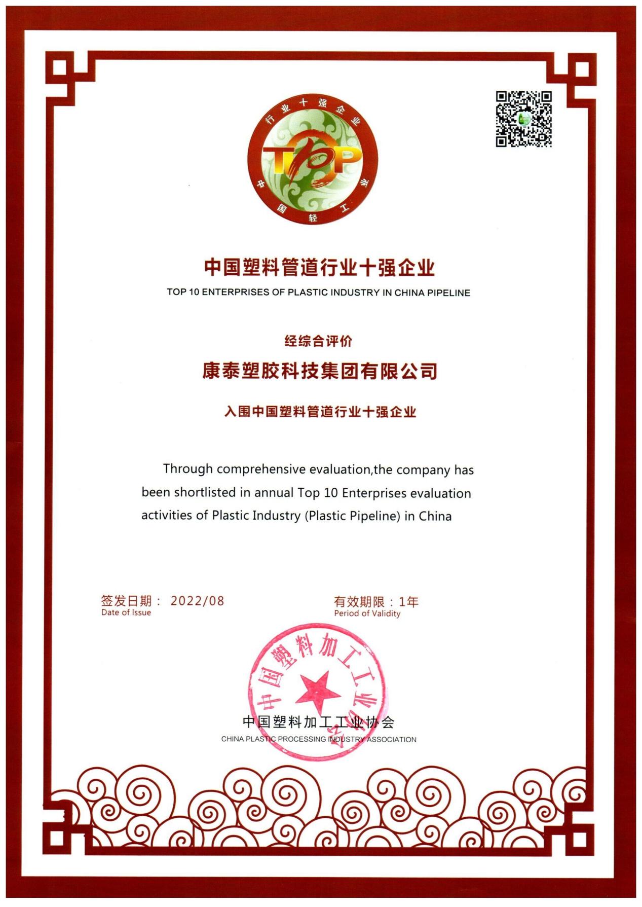日前,2022年度中國(guó)輕工業(yè)塑料管材行業(yè)十強(qiáng)企業(yè)評(píng)價(jià)結(jié)果揭曉,康泰集團(tuán)連續(xù)七年榮獲“中國(guó)輕工業(yè)塑料行業(yè)(塑料管道)十強(qiáng)企業(yè)”稱(chēng)號(hào)。