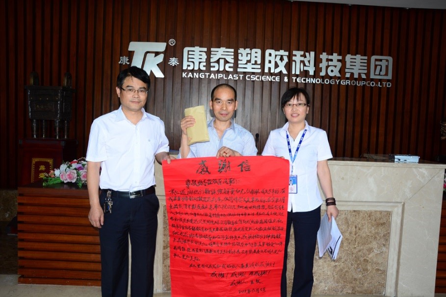 ?????? 在接收現(xiàn)場(chǎng),集團(tuán)工會(huì)主席吳彬和人力資源中心經(jīng)理呂旭梅熱情的接過了王敏的感謝信,同時(shí)將全體康泰人的愛心捐款和康泰愛心基金撥款共計(jì)3萬余元轉(zhuǎn)交給了王敏本人,并祝愿他早日康復(fù),囑咐他一定要好好治病,早日回到康泰,回到工作中來。接過捐款,王敏的心情很激動(dòng)。雖然他的身體還不適合大量運(yùn)動(dòng),但他還是堅(jiān)持要親自到公司來遞上感謝信。他說,“因?yàn)橛腥w各級(jí)領(lǐng)導(dǎo)和員工最真摯的愛心伴我同行,使我看到了康泰公司美好的未來。康泰就是我的家,希望康泰公司明天更加壯大,更加美好!在這里,我代表我和我的家人最真誠的感謝公司及各位關(guān)心支持我的各位同仁、各位素不相識(shí)的人士!感謝!感謝!再感謝!”